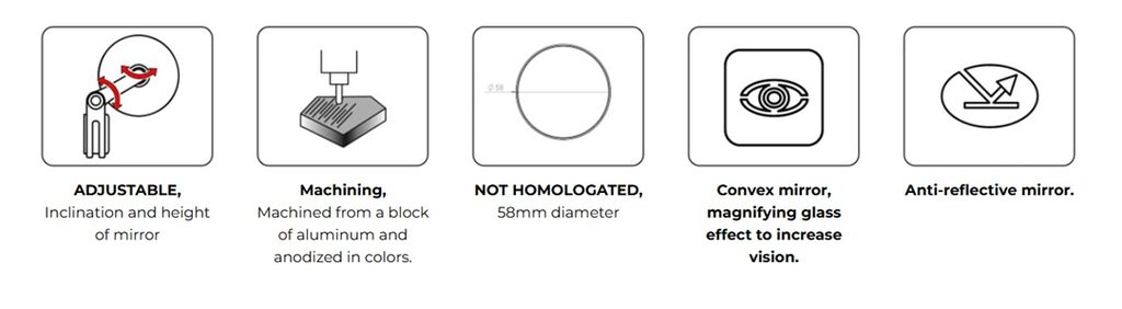 The Rearview Tracker is a non-homolagated product and its sizes are 58 mm in diameter, 92 mm in height and 72 mm in width (from the base) and in reference to the glass, the rearview mirror uses an antiglare glass to improve visibility during riding and it’s available for handlebars with internal diameter 13/18 mm.