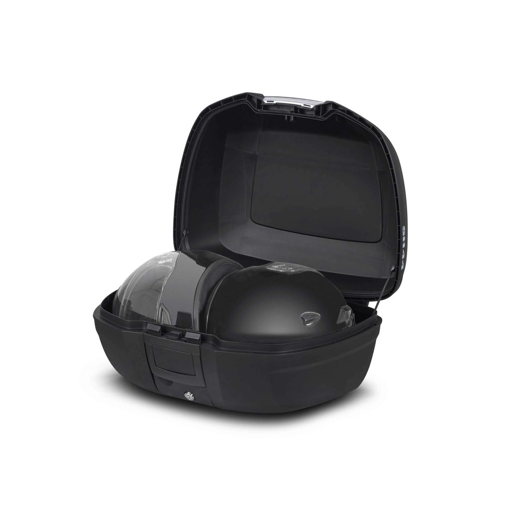 Its cubic shape has been inspired from trail cases and allows to carry a large volume of load inside, and has a capacity for 2 full-face helmets. “Handle Lock System” included, it simultaneously locks the access to the inside of the case and secures it to the motorcycle.
