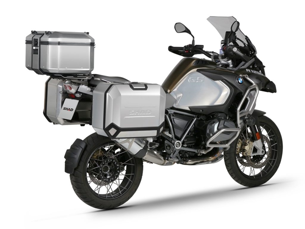 The complete set of cases SHAD TERRA includes aluminum top case TR37 with a capacity of 37L, aluminium left case TR47 with a capacity of 47L and a smaller right case TR36 with a capacity of 36L due to the location of the exhaust. The right suitcase will not protrude. The set contains everything you need to mount both suitcases to the motorcycle.