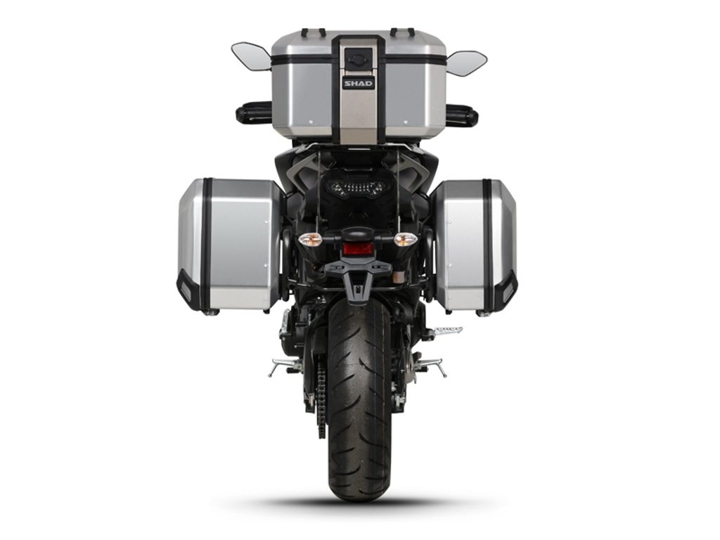 The complete set of cases SHAD TERRA BLACK includes black aluminum top case TR37 with a capacity of 37L, black aluminium left case TR47 with a capacity of 47L and a smaller black right case TR36 with a capacity of 36L due to the location of the exhaust. The right suitcase will not protrude. The set contains everything you need to mount both suitcases to the motorcycle.