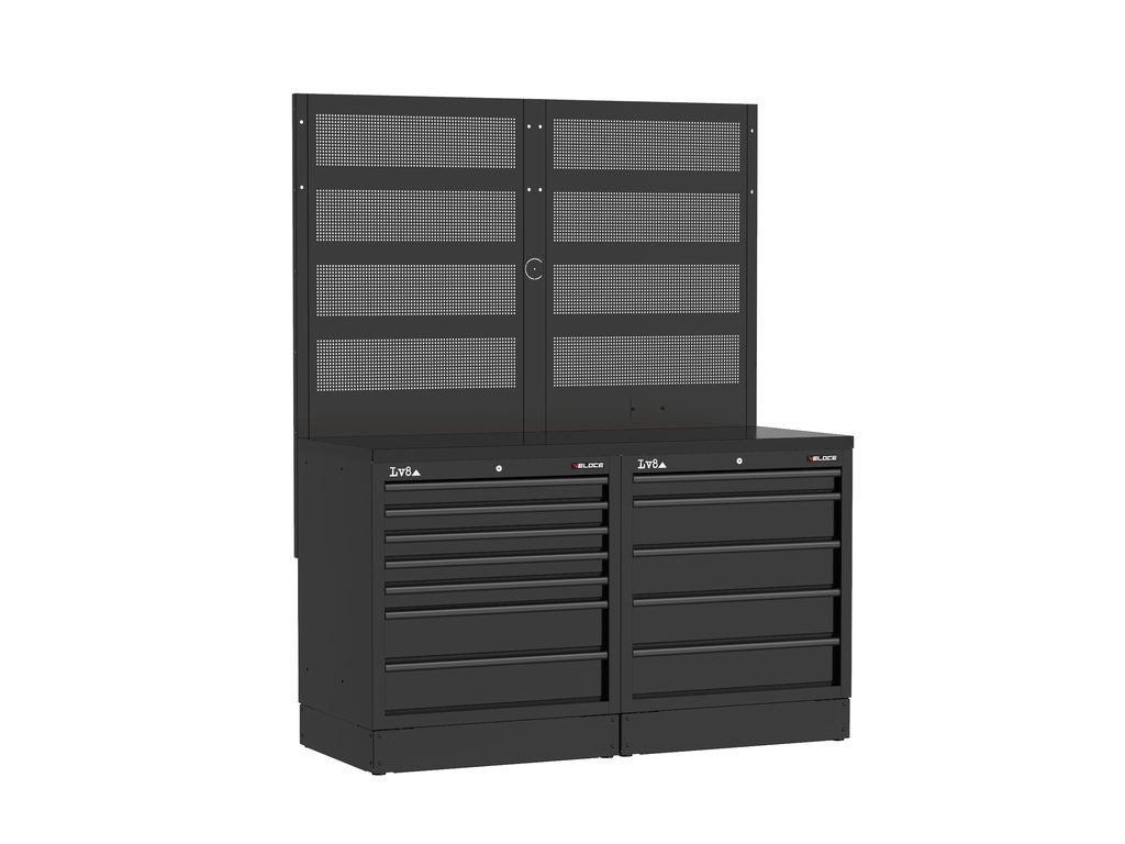 Workbench L. 1600 mm configured with 7-drawer cabinet and 5-drawer cabinet with key lock. Wooden top, double perforated tool holder panel with provision for an electric socket. Also available in stainless steel or melamine top versions.