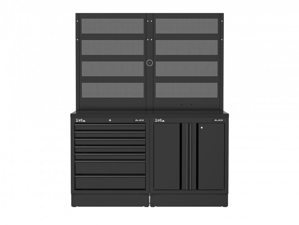 Workbench L. 1600 mm with 7-drawer cabinet, 2-door cabinet with inside shelf and key lock. Wooden top, double perforated tool holder panel with provision for an electric socket. Also available in stainless steel or melamine top versions.