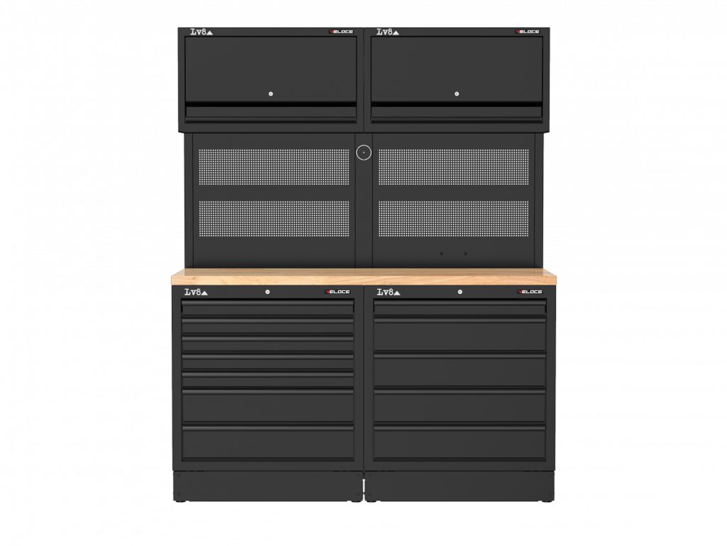 Workbench L. 1600 mm configured with 7-drawer cabinet, 5-cabinet with key lock. Wooden top, double perforated tool holder panel with 2 wall storage cabinets and provision for an electric socket. Also available in stainless steel or melamine top versions.