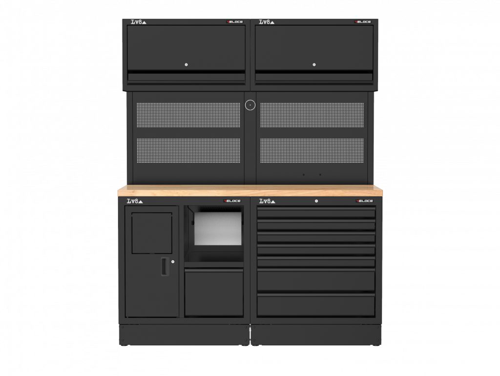 Workbench L. 1600 mm configured with service cabinet with waste bin, paper compartment and storage drawer, 7-drawer cabinet with key lock. Wooden top with double perforated tool holder panel, 2 wall storage cabinets and provision for an electric socket. Also available in stainless steel or melamine top versions.