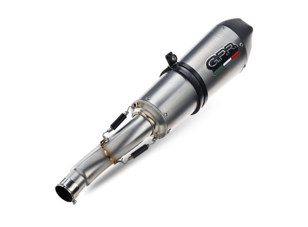 GPR's New Grand Prix Evo Titanium - the Silencer is conical, with a special shape starting from a diameter 90mm to arriva at 130mm of circonference and lenght that depend from the motorbike of destination. It has a sleever made in titanium realized with natural color, black endcap made through CNC machining with pentagonal exit and dbkiller.