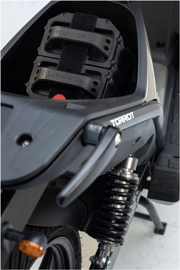 Under its careful “friendly scooter” appearance is state-of-the-art technology designed to propel you around the city efficiently thanks to its electronic controller developed by Torrot Electric, which connects with the latest smartphones for total control. At a single glance, its eccentric single shock absorber tells you that there’s technology here… you know, the good kind! ;-)