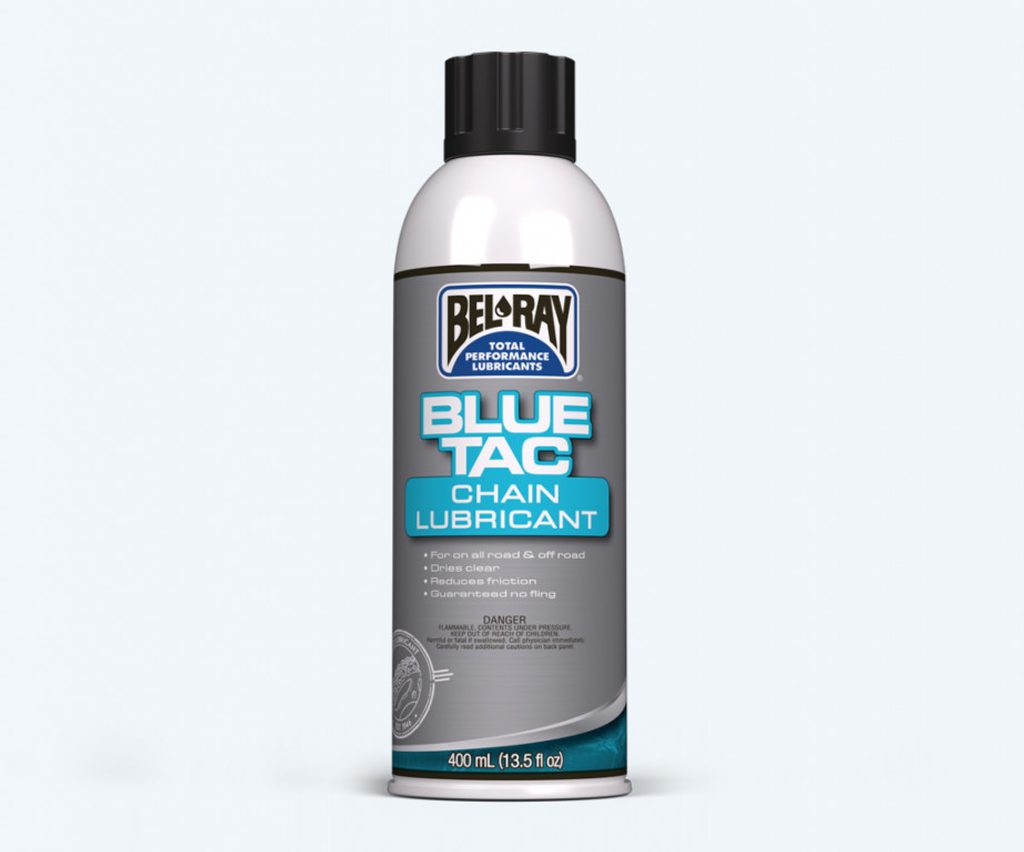 Bel-Ray Blue Tac Chain Lube is a high-performance, fully synthetic chain lube for all powersports chain applications. Developed with input from professional racing teams, Blue Tac Chain Lube offers an extremely tacky formula that will not fling off when used as directed. Professional racing teams and dyno tests have proven that even at speeds of 100 mph and up, Bel-Ray Blue Tac Chain Lube remains in place on your chain, providing the performance and protection you require.