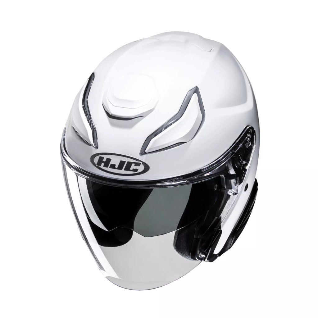 F31 PEARL WHITE – eleganta un praktiska pusķivere ar saulesbrilli, ideāli piemērota pilsētas braucieniem ar maksimālu komfortu un drošību.