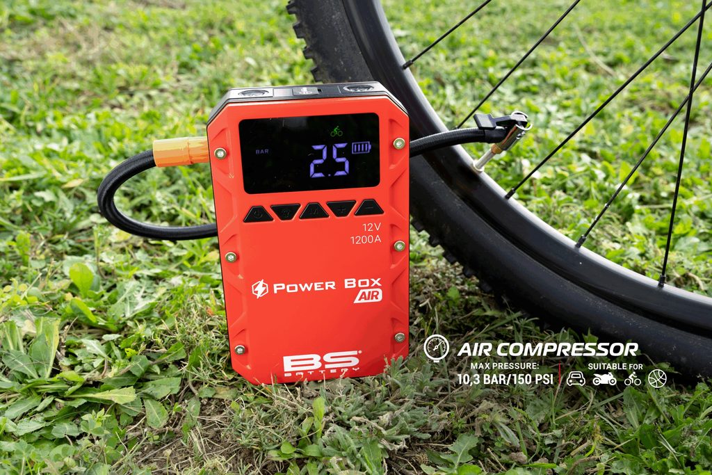 Meet the Power Box AIR – more than just a jump starter. This compact and powerful 1200A booster not only revives 12V lead-acid batteries with up to 20 jump starts per charge, but also features a built-in air compressor delivering up to 10.3 bar / 150 PSI for tires, sports gear, and more.