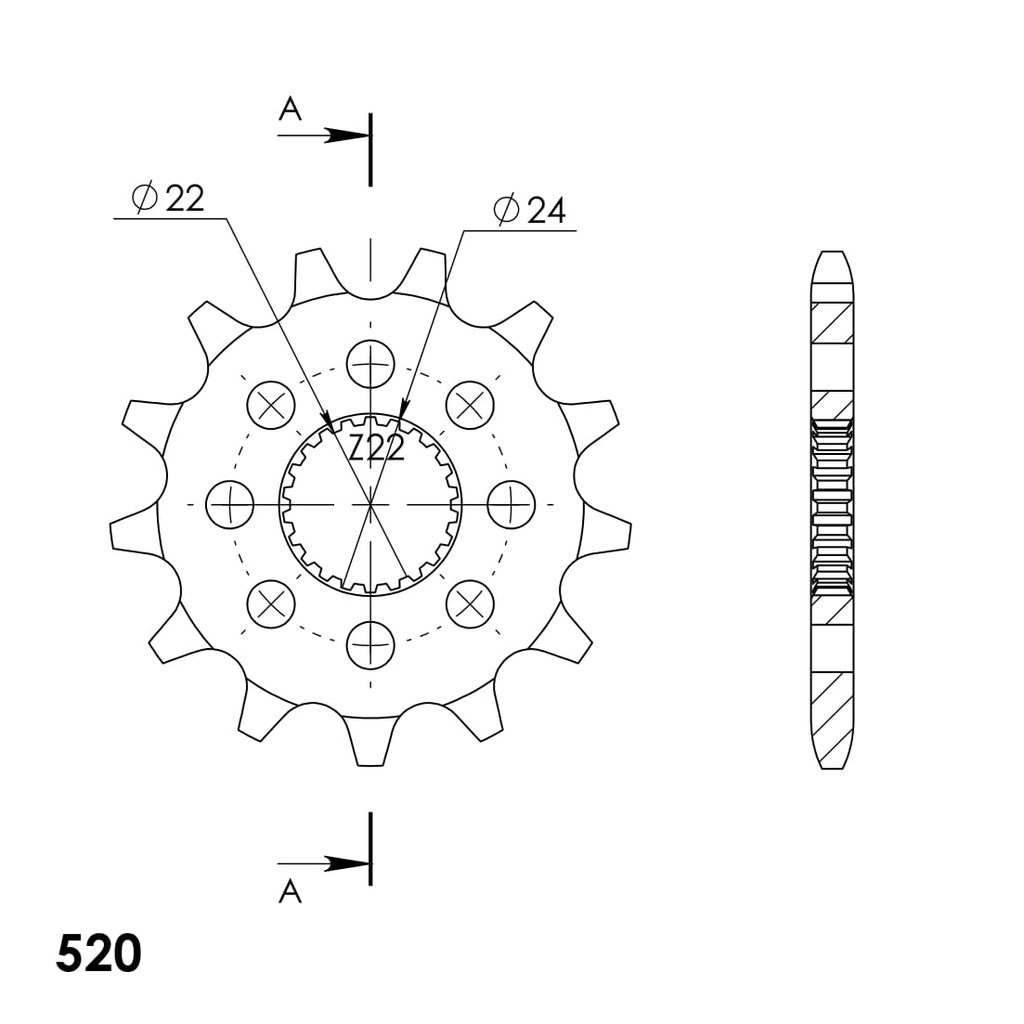 Every sprocket has weight reduction, with radial holes or radial slots (Forged models only) .