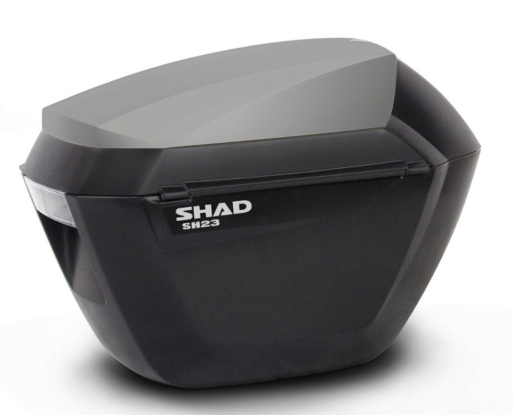 The SH23 side cases stand out for their elegance, lightness, and functionality. They are highly aerodynamic and remain strong and watertight. The top-opening function allows the rider to access the inside of the case without getting off the bike.