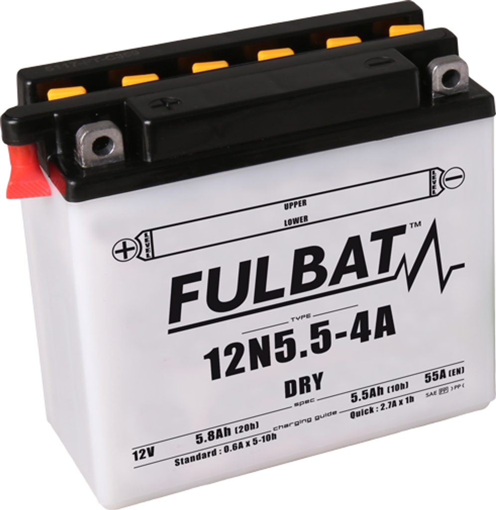 Conventional lead acid battery (dry charged), delivered dry, including acid pack, JIS standard 12N5.5-4A, dimensions 135x60x130mm. Vairāk informācijas