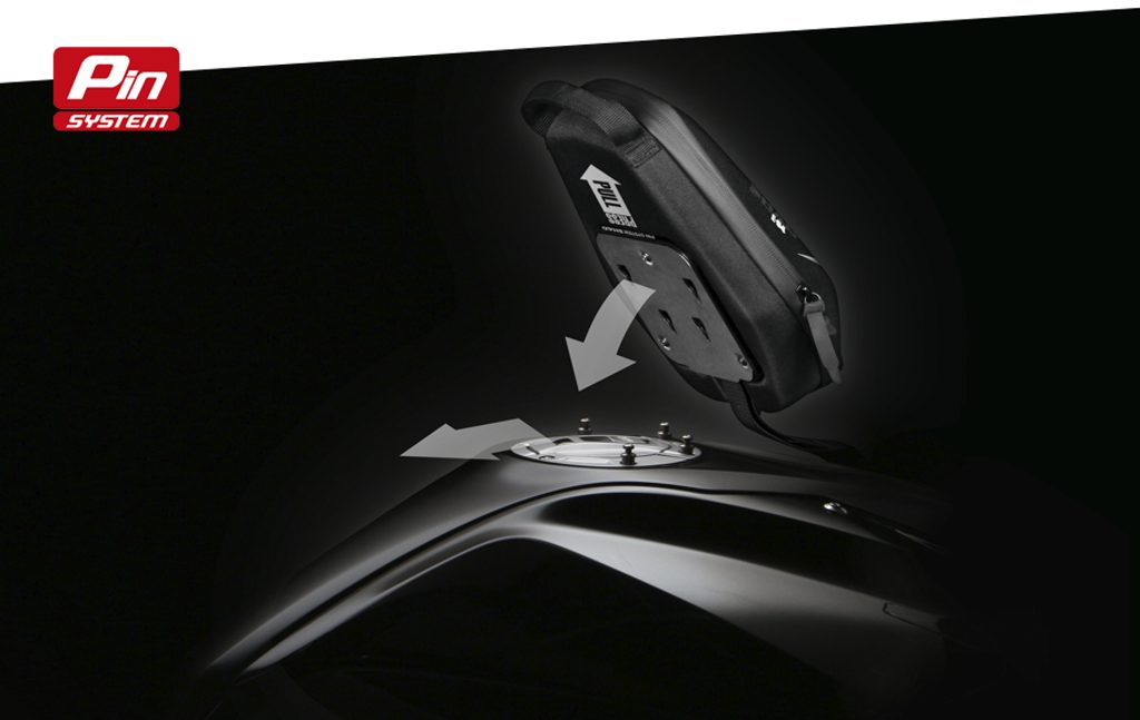 The innovative PIN SYSTEM secures the tank bag to the motorcycle in a safe and easy way. 3 or 4 of the original gas cap screws are replaced with the discrete 'pins', making the installation very simple and done in only a few minutes.